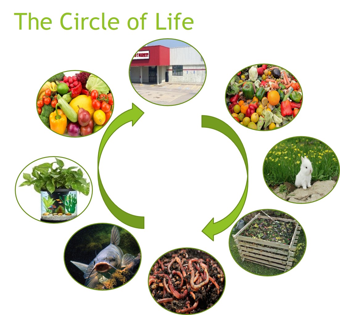 ALMOST ALL plant waste plus rabbit and poultry waste can be used in your compost pile. See the Composting page for additional information on creating healthy compost for your plant and insect crops. Once a healthy compost pile has been started you introduce it to the insect/worm crops which in turn will be food for the fish in the aquaponics system. The fish waste is used to feed the plants. Aquaponics fertilized plants have been shown to produce 4 times per square foot of growing area versus traditional gardening. The produce is then used to feed the humans and animals and the cycle begins again.